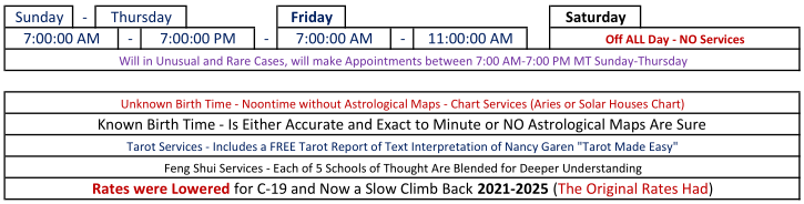 The consultation services for Astrology, Tarot, Feng Shui, Numerology, I-Ching, and other service of a Metaphysical associated or related subject is for your enjoyment and entertainment. Although, you are likely going to experience any of the forecasted or predicted event's within the content of services in this website; it should be recognized that it is only suggested and percieved as happening, while these abovementioned indication's are for your own enjoyment and entertainment.